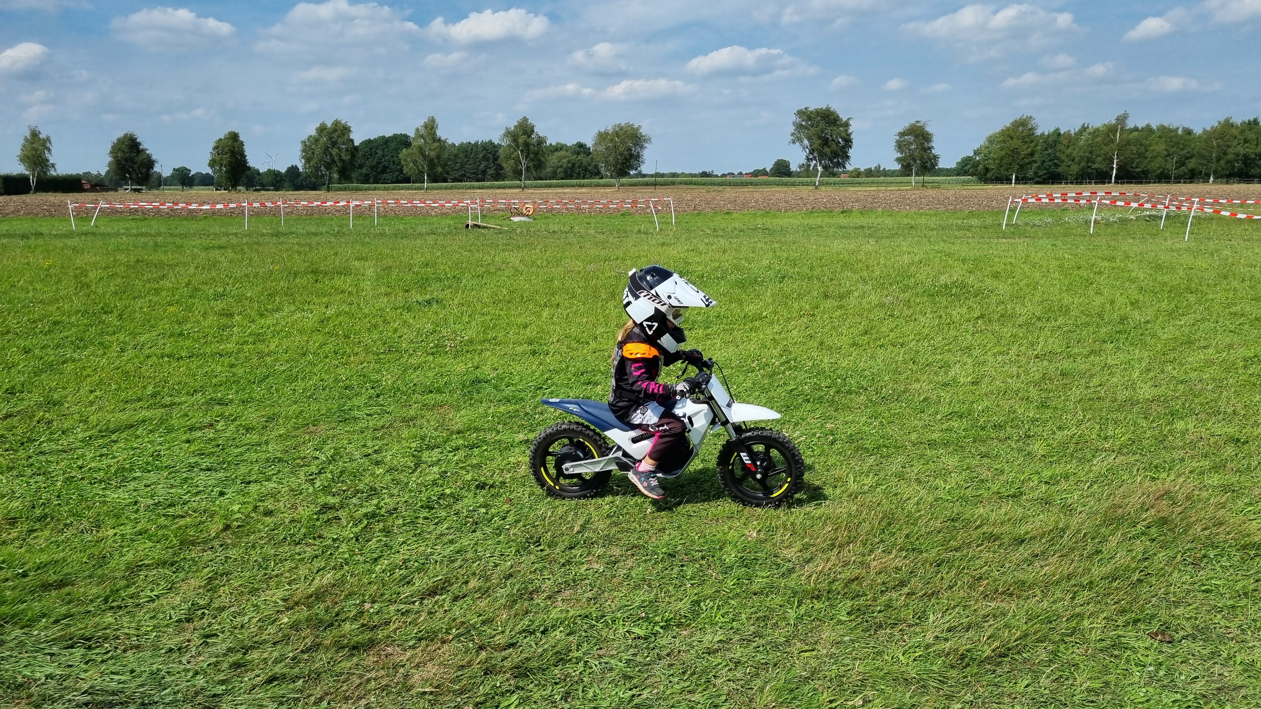 Nach dem gemeinsamen Frühstück und der offiziellen Begrüßung startete der Tag mit gemischtem freiem Fahrtraining auf der großen Strecke und auch auf der Kinderstrecke herrschte reger Betrieb. Nach der Mittagspause mit Hot Dogs und frischem Obst für alle fand auf dem eigens abgetrennten Bereich auf der Wiese das erste Kindertraining statt. Vorbereitet war ein Parcour aus schmalen Durchfahrten, einer Wippe sowie einem Hütchenslalom, der von den Kids spielerisch und mit großem Spaß bewältigt wurde.