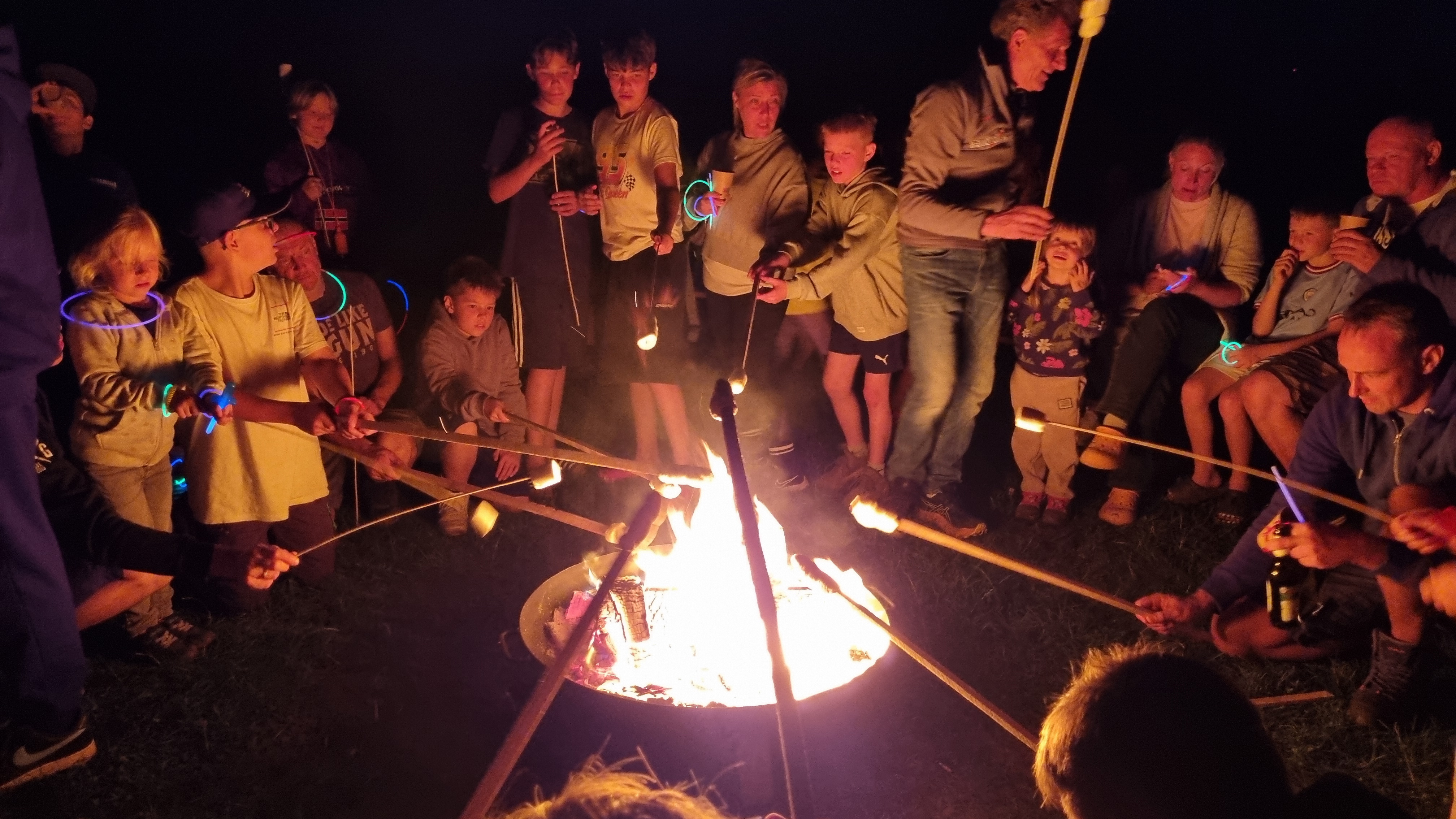 Anschließend lockte der Duft gegrillter Leckereien zum eigens bereitgestellten Grillwagen. Ein reichhaltiges Büffet von leckeren Salaten komplettierte das Abendmenü. Mit Anbruch der Dunkelheit wurde das Lagerfeuer zum gemütlichen Mittelpunkt des geselligen Beisammenseins. Da scheinbar ein Troll den Stockbrotteig entwendet hatte, begaben sich die Kids ausgestattet mit Leuchtbändern und Taschenlampe auf die erfolgreiche Suche. Denn nicht nur der Stockbrotteig wurde von der Meute wimmelnder Leuchtpunkte wiedergefunden, neben einer ansehnlichen Tasche voller Süßigkeiten wurden auch Marshmellows als fette Beute ins Camp zurückgeschleppt. Flugs wurden Stockbrotteig und Marshmellows aufgespießt, über dem Feuer geröstet und genüsslich (und restlos) vertilgt.